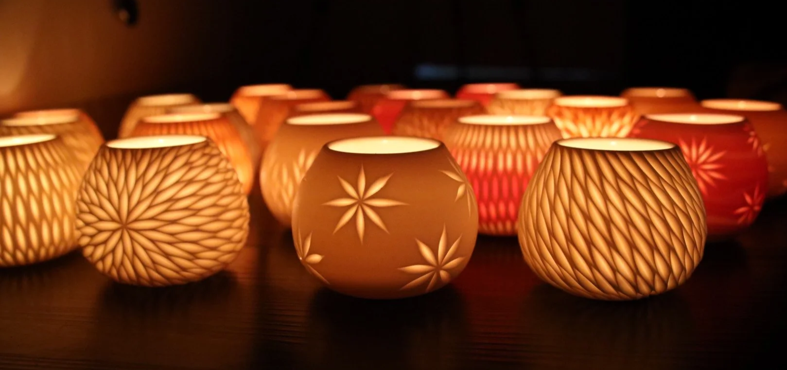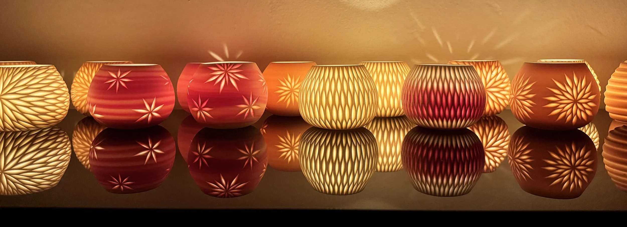 Exterior Finish options: Glossy, Matte, or Semi-Matte (glossy in carved grooves, matte on un-carved surface). See examples here. This size works great with regular tea lights.
