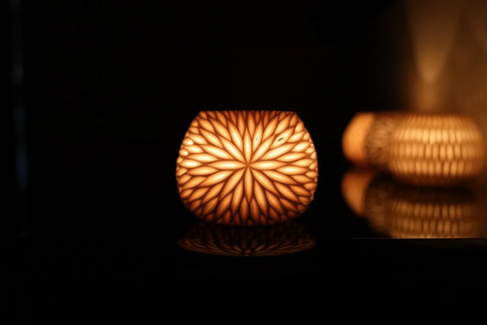 This is the starburst pattern carved deeper so that some of the lines cut through, allowing for a brighter glow and light beams to cast off from the luminary against a wall or table, depending of placement.